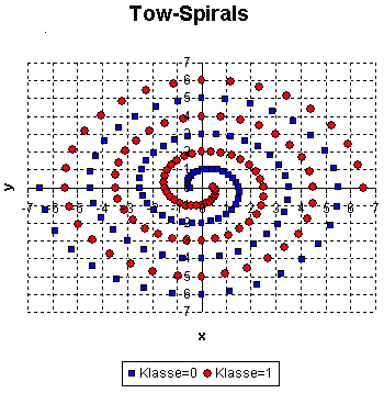 Zwei Spiralen Problem. Die Aufgabe ist, zwischen zwei Trainingsmengen die auf zwei unterschiedlichen Spiralen in der x-y Ebene liegen (im Bild blau und rot), zu unterscheiden. Beide Spiralen winden sich drei mal um den Nullpunkt und um sich selber. Diese Problem wird oft als Benchmark-Test für neue Verfahren verwendet. |