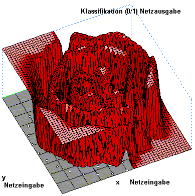 Zwei Spiralen Problem Fortsetzung. Für einen MLP Netz mit back-propagation-Algorithmus, ist es sehr schwer die Klassifizierung zu erlernen. Es sind sehr viele Hidden Neuronen und Lernschritte nötig. Das erlernte Netz ist in der obigen Darstellung visualisiert. Die beiden Eingabewerte werden auf der x- und y-Achsen abgetragen, auf der z-Achse ist die Netzwerkausgabe (Klassifikation 0 /1)aufgetragen. Netzwerk: MLP 2-20-10-1 (Zwei Eingabeneuronen, zwei hidden-Layer mit jeweils 20 und 10 Neuronen in der Schicht und einem Ausgabeneuron). |