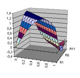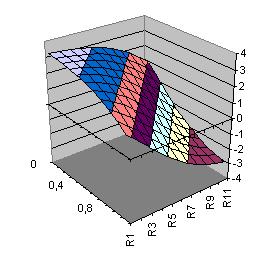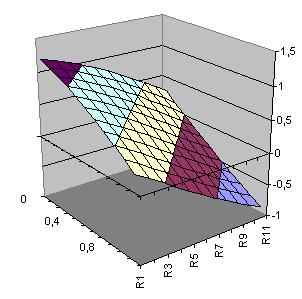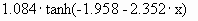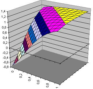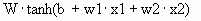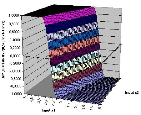 | Aktivierungsfunktion eines Hidden-Neurons für zwei Inputvariable h(x1,x2)=1,084*tanh(0.5+0.5*x1-1,5*x2) |